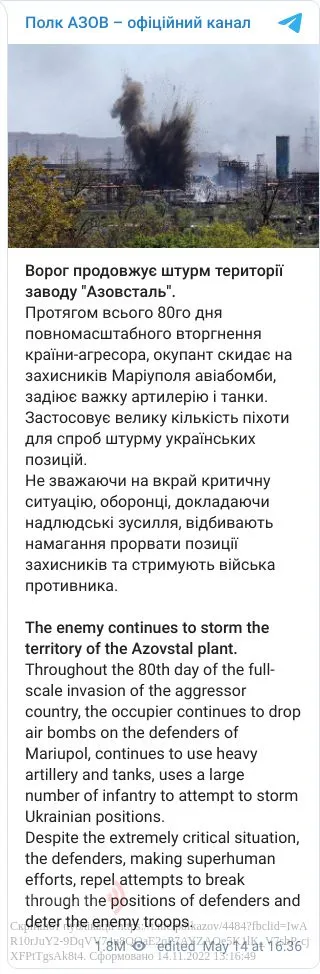 «Протягом всього 80-го дня повномасштабного вторгнення країни-агресора, окупант скидає на захисників Маріуполя авіабомби, задіює важку артилерію і танки. Застосовує велику кількість піхоти для спроб штурму українських позицій», - йдеться у повідомленні.
