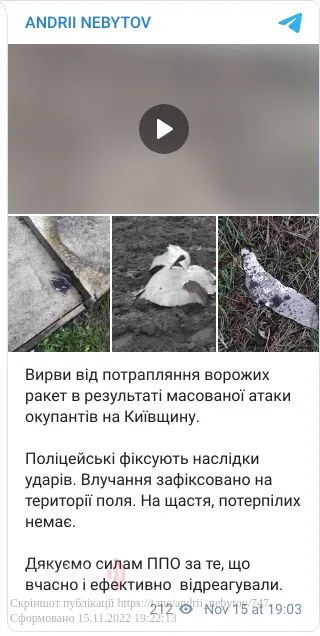 «10 будинків пошкоджено через атаку окупантів в одному з районів Київщини. Водночас завдяки успішній роботі сил ППО потерпілих серед цивільного населення немає. Поліціянти Київщини продовжують фіксувати наслідки ракетних ударів ворога», – йдеться у повідомленні.