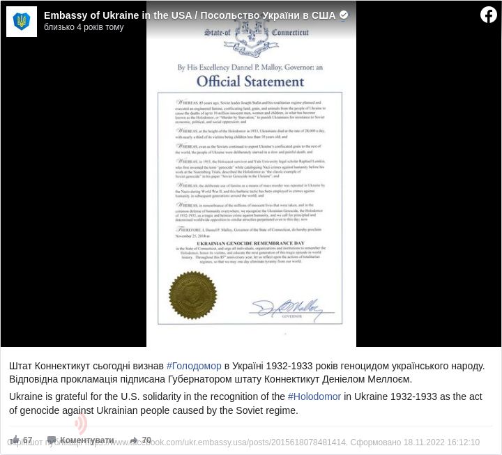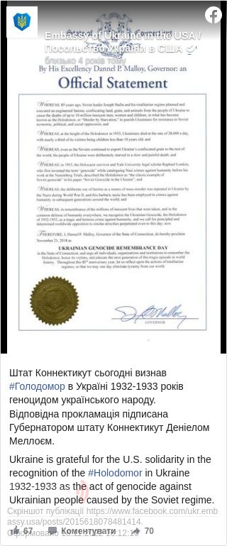 Таким чином, Коннектикут став 21-м штатом, який визнав Голодомор геноцидом.