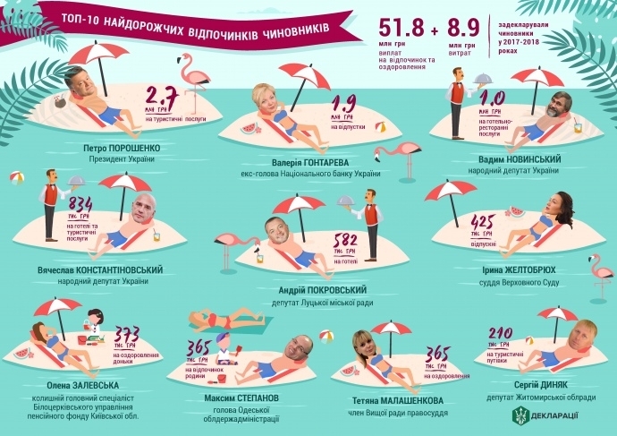 Загалом у 2017-2018 роках українські чиновники задекларували близько 9 млн гривень витрат на відпочинок і ще майже 52 млн гривень відпускних їм було виплачено.