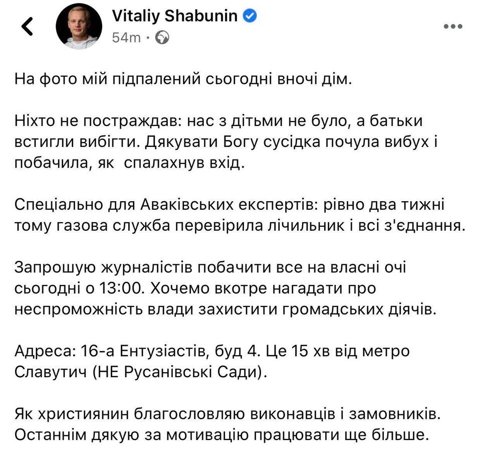 Вночі, 23 липня, керівнику громадської організації «Центр протидії корупції» Віталію Шабуніну підпалили будинок.