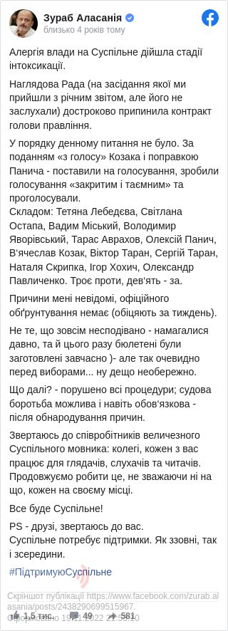 Звільнений із посади голови правління «Суспільного мовлення» Зураб Аласанія стверджує, що йому невідомі причини такого рішення НСТУ. Він також додав, що «судова боротьба можлива і навіть обов’язкова, після оприлюднення причин».