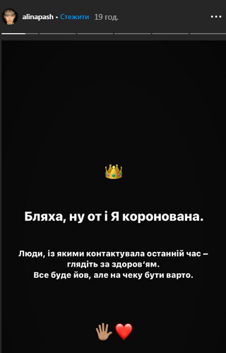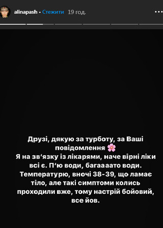 Аліна Паш розповіла, що наразі перебуває на самоізоляції, підтримує зв'язок з лікарем та приймає усі необхідні препарати.Вона зізналася, що вночі у неї піднялася температура до 38-39 градусів та присутня ломота в тілі. Крім того, співачка зауважила, що п'є дуже багато води.