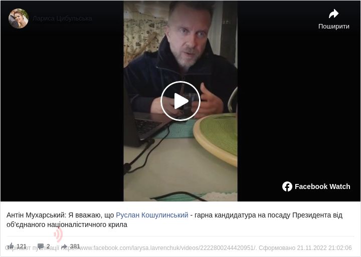 «Руслан Кошулинський був депутатом одного зі скликань Верховної Ради України. Я знаю його особисто. Мені подобається у Кошулинському його поміркованість, щира вдача, інтелектуальна підкованість, прекрасне почуття гумору. У Руслана Кошулинського є військовий досвід: він служив на фронті. Те, що націоналісти висунули єдину кандидатуру — це велика перемога. Кошулинського не підтримали лише у »Національному корпусі«, й я не говоритиму своїх суб'єктивних роздумів, чому так сталося. Але все ж Кошулинський — це гарна кандидатура від націоналістичного крила», — зазначив Мухарський.
