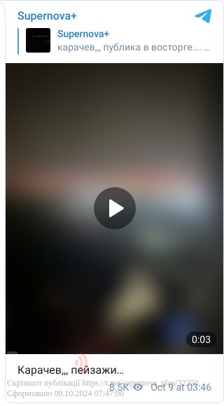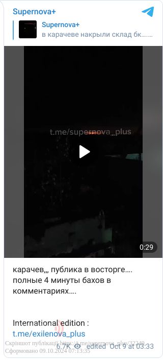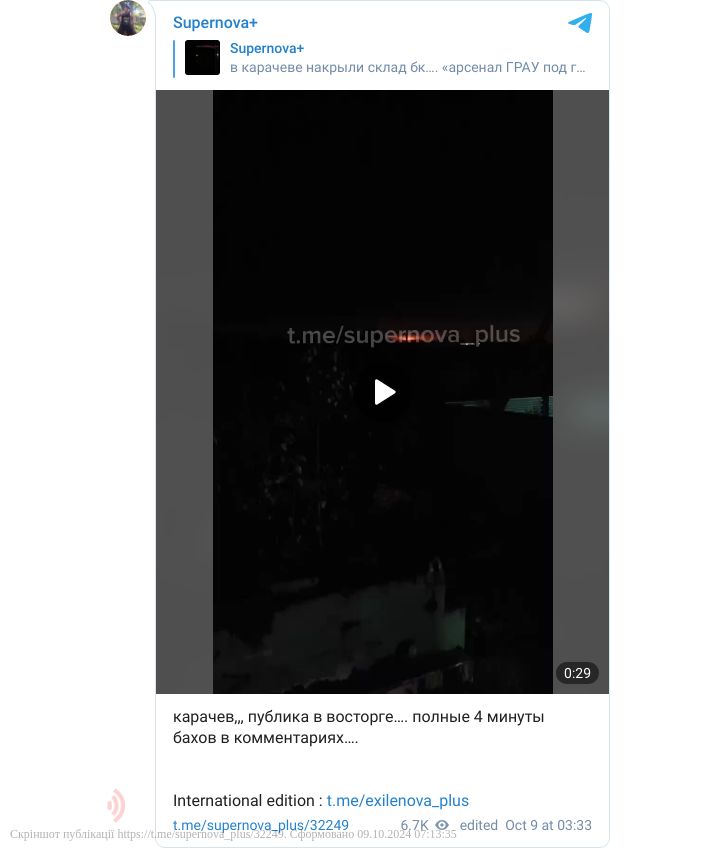 У ніч на 9 жовтня у Брянській області (РФ) місцева влада звітувала про «відбиття» атаки дронів. Натомість біля міста Карачев сталася пожежа і лунають вибухи, ймовірно, є влучання по великому складу боєприпасів.