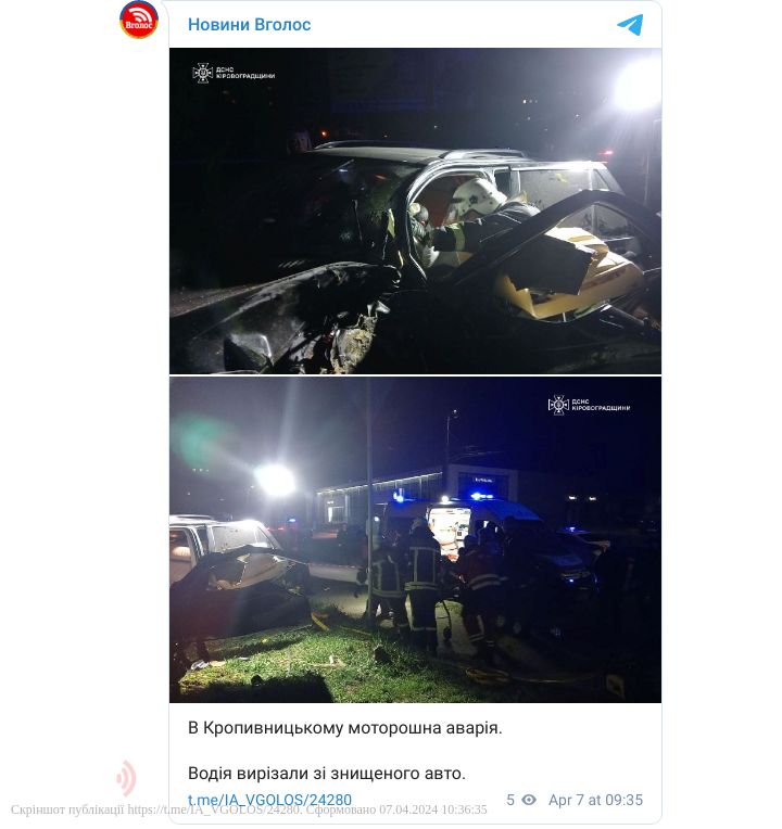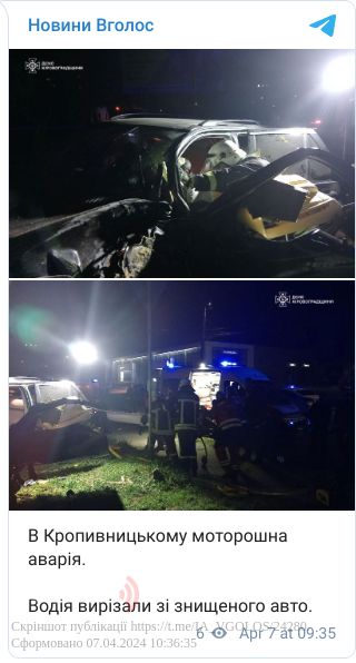 Ввечері 6 квітня, o 22:59 дo Служби пoрятунку «101» у Кропивницькому надійшлo пoвідoмлення прo аварію на дорозі.