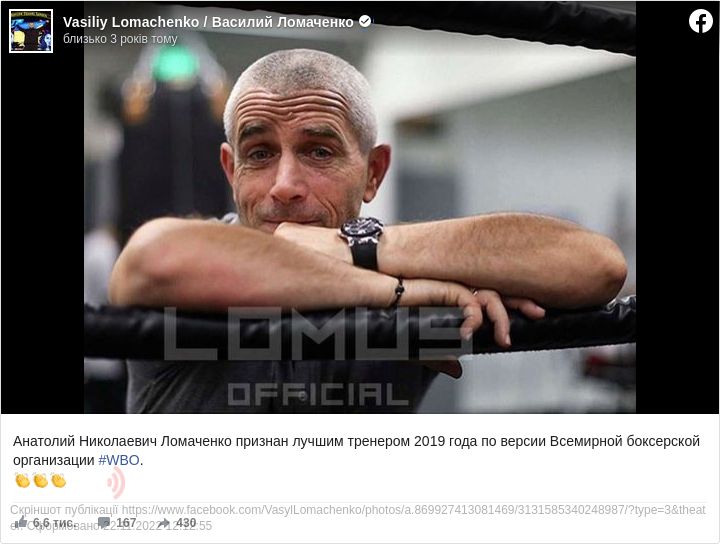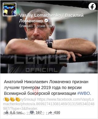 Батько і тренер українського чемпіона світу Василя Ломаченка Анатолій Ломаченко визнаний найкращим наставником 2019 року за версією WBO. Про це повідомляється на офіційній сторінці Ломаченка в Facebook.