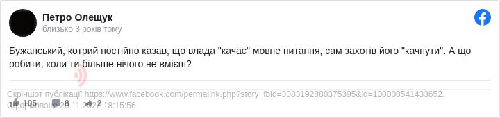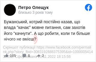 Експерт написав: «Бужанський, котрий постійно казав, що влада »качає« мовне питання, сам захотів його »качнути«. А що робити, коли ти більше нічого не вмієш?».