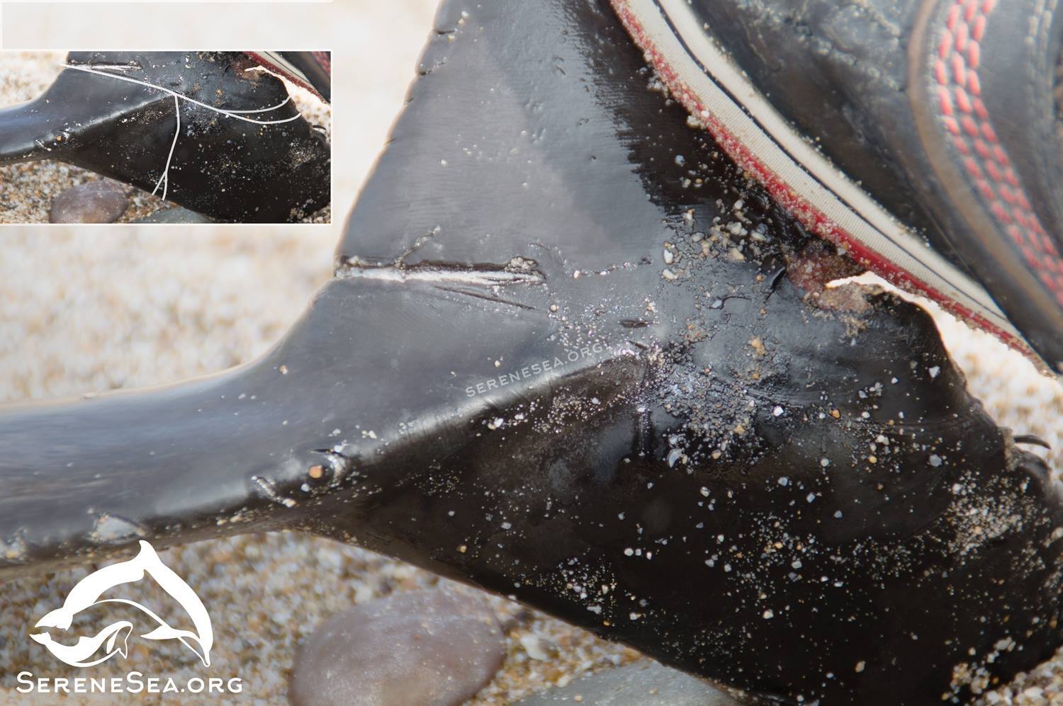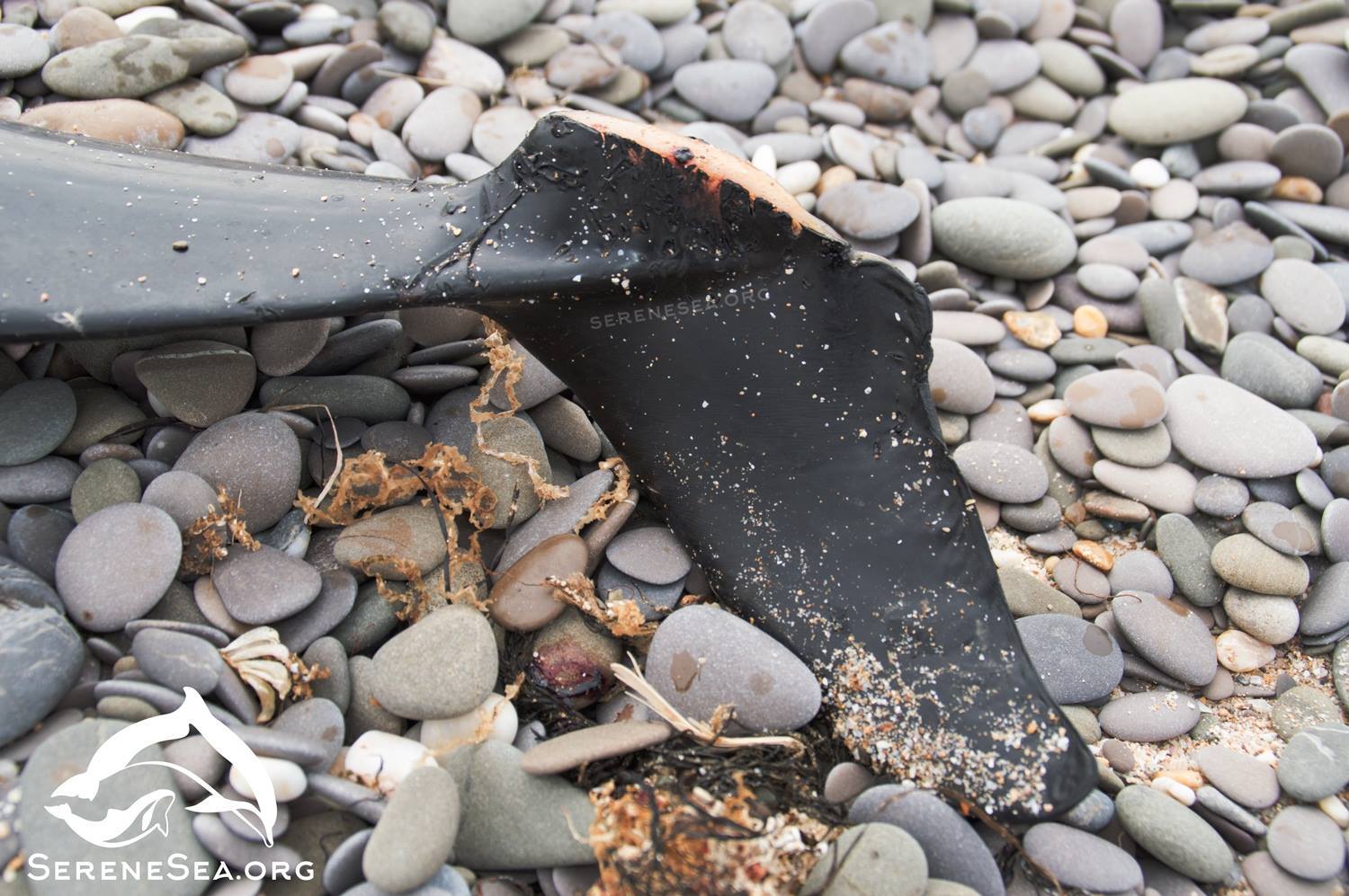 Поряд із китоподібними на берег вимило величезну кількість фрагментів сіток і волосіні, а також останки однієї особини чорноморського осетра.