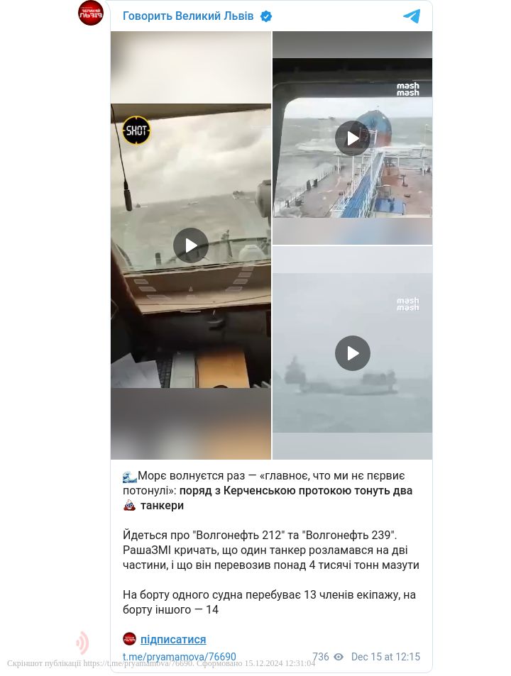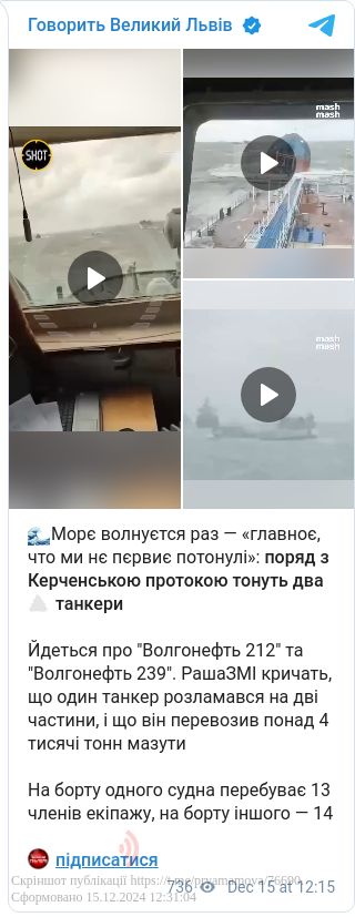 Російський танкер «Волгонефть-212», що перевозив близько 4,3 тисяч тонн мазуту, зазнав катастрофи поблизу берегів Керчі у тимчасово окупованому Криму.