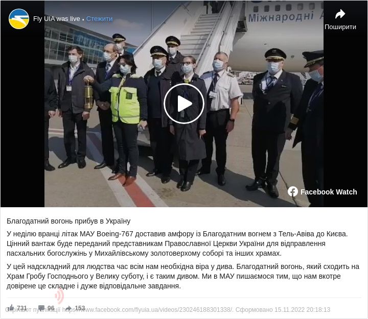 «У цей надскладний для людства час всім нам необхідна віра у дива. Благодатний вогонь, який сходить на Храм Гробу Господнього у Велику суботу, і є таким дивом»,- додали у МАУ.