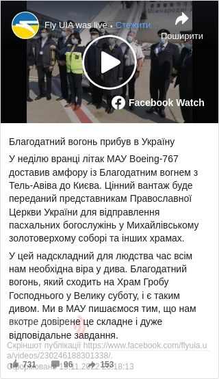«У неділю вранці літак МАУ Boeing-767 доставив амфору із Благодатним вогнем з Тель-Авіва до Києва. Цінний вантаж буде переданий представникам Української Православної Церкви для відправлення пасхальних богослужінь у Михайлівському золотоверхому соборі та інших храмах»,- йдеться в повідомленні.