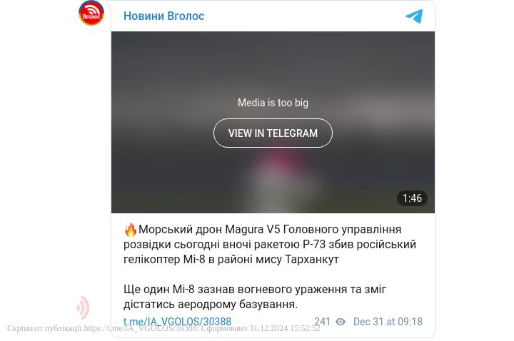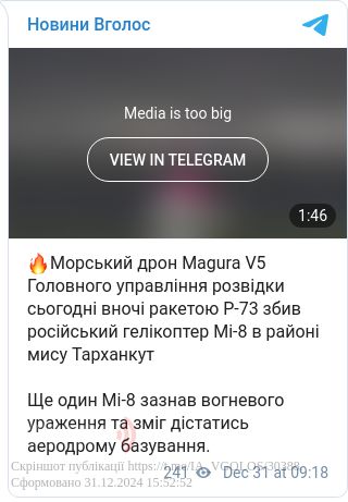 «Сьогодні вперше гелікоптер був збитий, він впав у воду. Тобто факт знищення повітряної цілі над акваторією Чорного моря зафіксований. Другий, до речі, так само був підбитий. Він зміг дотягнути до аеродрому, сісти на вимушену посадку» - розповів Буданов.