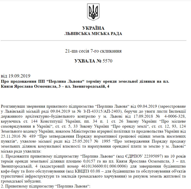 Йдеться про Володимира Стасишина – співзасновника ПП «Перлина Львова». Він колишній начальник регіональної філії Державного земельного кадастру.