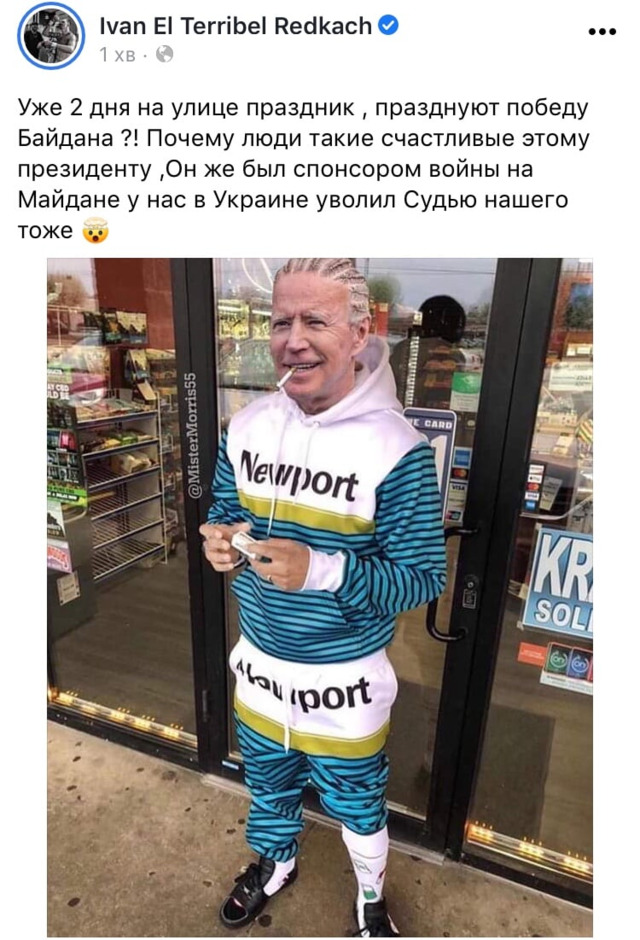 «Уже 2 дні на вулиці свято, святкують перемогу Байдена ?! Чому люди так щасливі цьому президенту? Він же був спонсором війни на Майдані у нас в Україні, також звільнив нашого суддю», - написав Іван Редкач.[media=80408]
