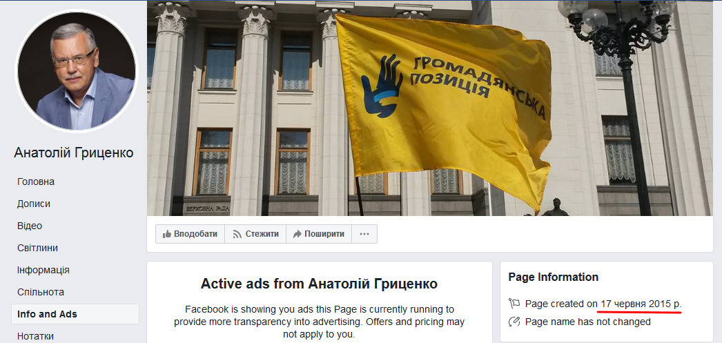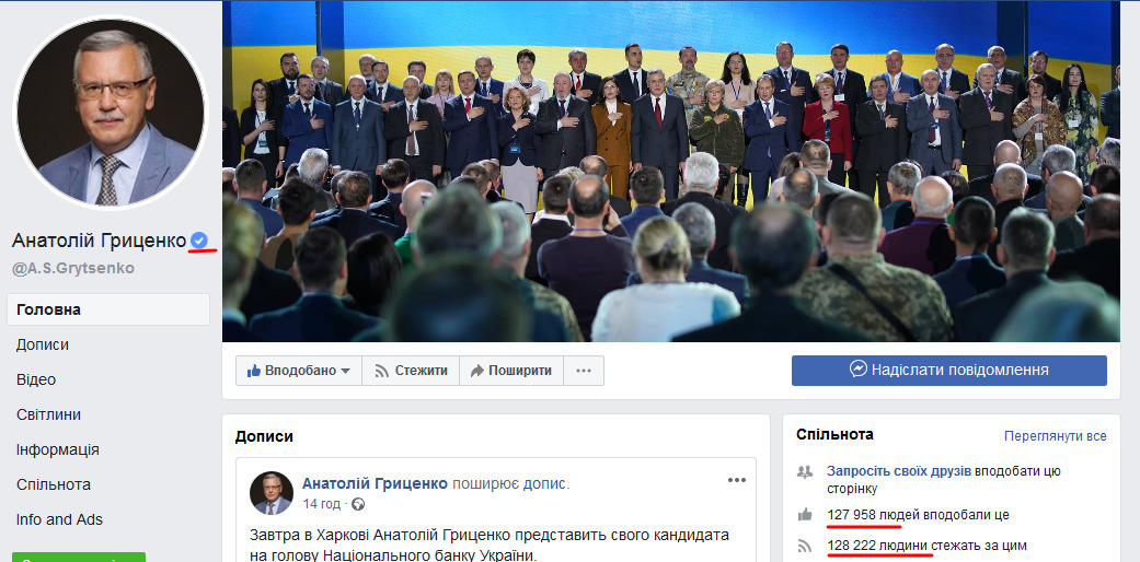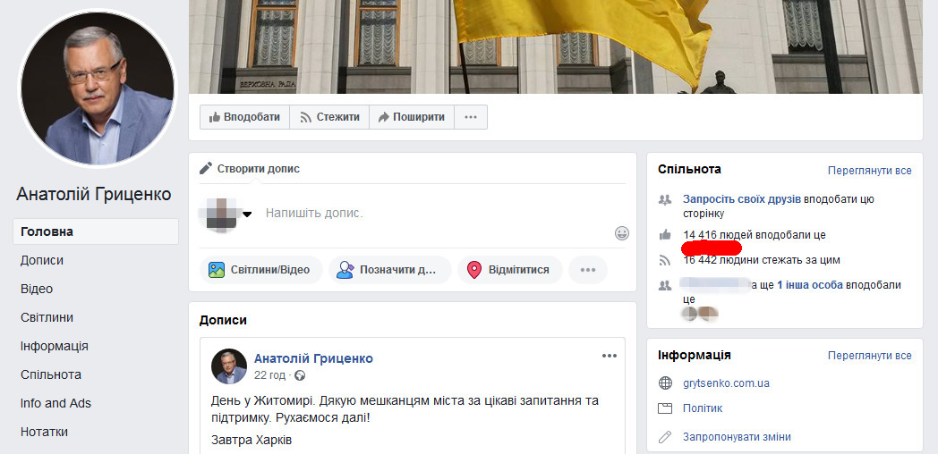 Зазначається, що наразі у мережі існують дві сторінки Гриценка: особиста - створена у 2015 році (налічує 14 тис підписників) та новостворена у січні 2019 року із 127 тисячами нібито прихильників політика.