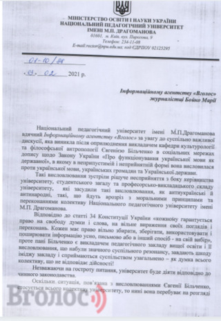 Керівництво НПУ ім. Драгоманова зазначило, що «їхній викладацький склад засудив Більченко за її українофобські висловлювання». Проте там нагадали про статтю 34 Конституції України, у якій йдеться про те, що «кожен громадянин має право на свободу думки, слова, на вільне вираження своїх поглядів».