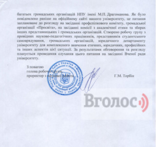 «Незважаючи на гостроту питання, Університет буде діяти відповідно до законодавства», - йдеться у відповіді.Разом з тим в НПУ ім. Драгоманова запевнили, що вони вивчають ситуацію із висловлюваннями Більченко та обговорять це на Вченій раді університету.