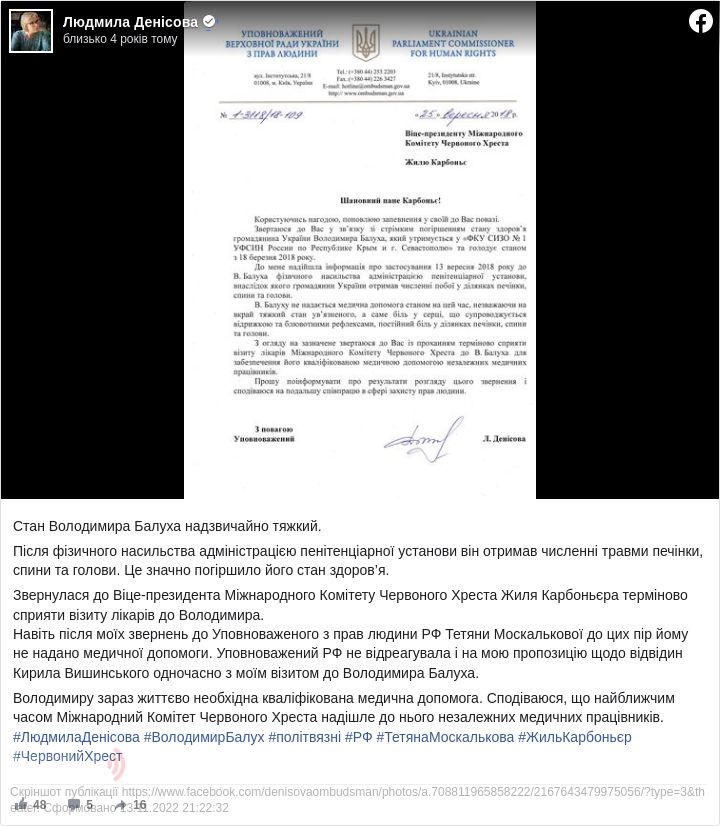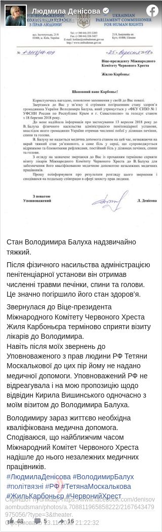 «Навіть після моїх звернень до Уповноваженого з прав людини РФ Тетяни Москалькової до цих пір йому не надано медичної допомоги. Уповноважений РФ не відреагувала і на мою пропозицію щодо відвідин Кирила Вишинського одночасно з моїм візитом до Володимира Балуха. Володимиру зараз життєво необхідна кваліфікована медична допомога. Сподіваюся, що найближчим часом Міжнародний Комітет Червоного Хреста надішле до нього незалежних медичних працівників», – наголосила омбудсмен.