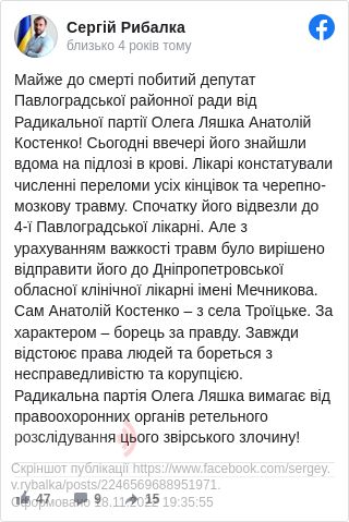 Депутата Павлоградської районної ради від Радикальної партії Олега Ляшка Анатолія Костенка невідомі побили майже до смерті 22 грудня. У нього діагностували численні переломи усіх рук і ніг, а також черепно-мозкову травму.