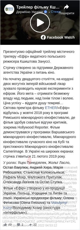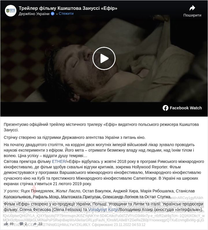 Державне агентство України з питань кіно презентувало офіційний трейлер містичного трилеру «Ефір» видатного польського режисера Кшиштова Зануссі.