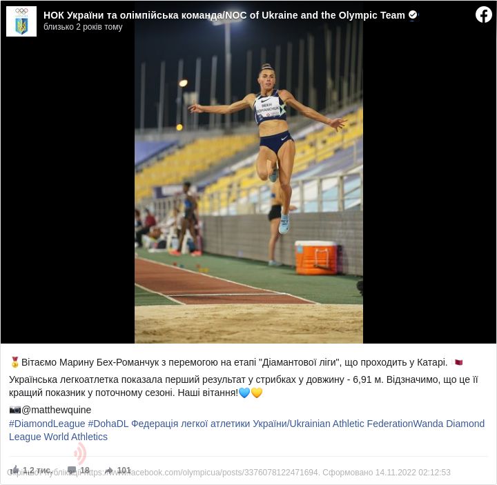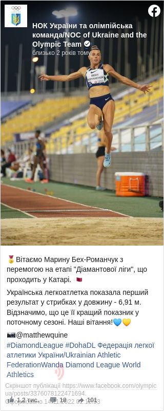Українська стрибунка у довжину Марина Бех-Романчук перемогла на останньому етапі Діамантової ліги у 2020 році. Вона з особистим рекордом сезону виграла турнір в Досі, повідомляє Національний олімпійський комітет у Facebook.