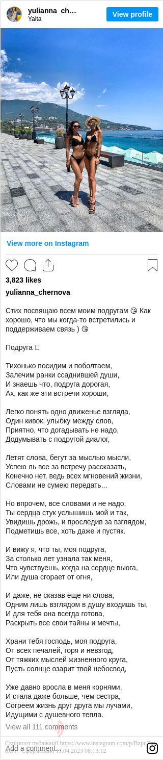 Як зазначила Юліана в коментарях до фотографій, вона поїхала до Ялти, щоб зустрітися там зі своєю хорошою подругою. Дівчата сфотографувалися на набережній Ялти, а також Юліана показала відео з гори Ай-Петрі.
