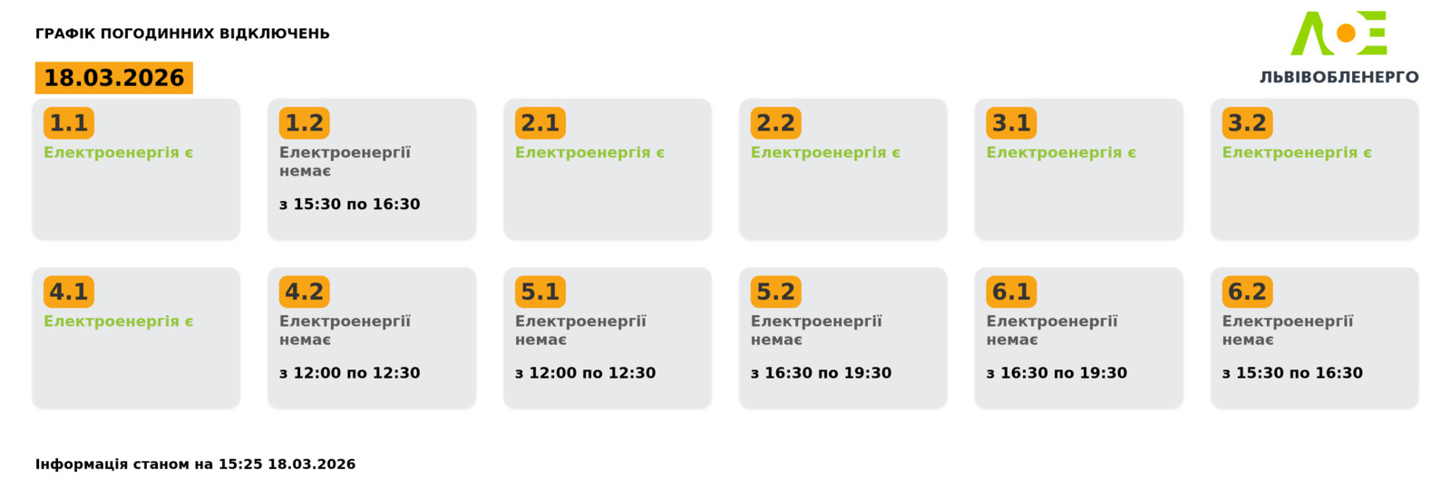 Група 1.2. Електроенергії немає з 15:30 до 16:30.