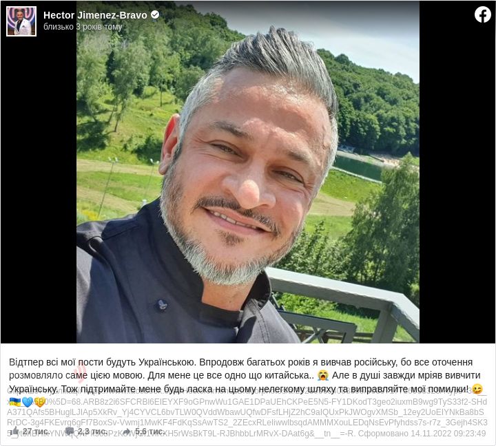 Канадський та український шеф-кухар колумбійського походження, бізнесмен, і телеведучий Ектор Хіменес-Браво заявив, що відтепер усі його пости у соцмережі будуть виключно українською мовою.