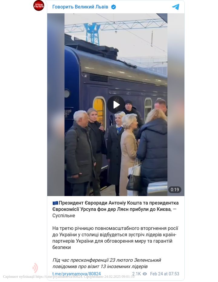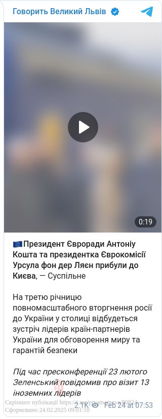 24 лютого, у третю річницю повномасштабного вторгнення Росії в Україну, до Києва прибули президентка Єврокомісії Урсула фон дер Ляєн та президент Євроради Антоніу Кошта.