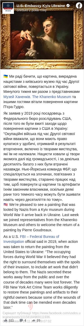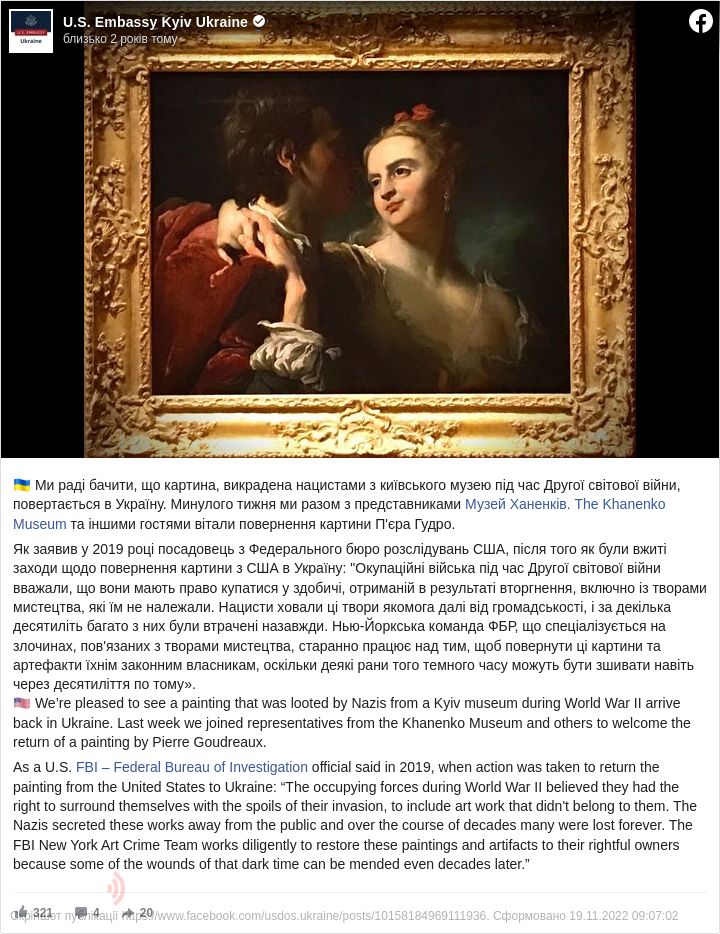 Посольство США привітало повернення до України вкраденої під час Другої світової війни картини «Коханці» відомого французького майстра 18-ого століття П’єра Гудро.