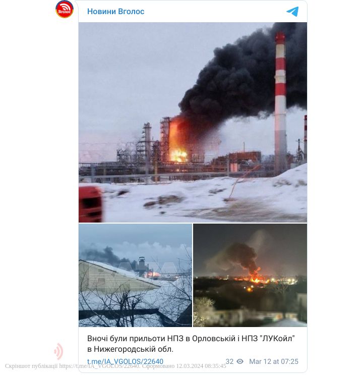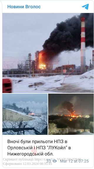 Безпілотник атакував нафтопереробний завод «Лукойл-Нижньогороднафтооргсинтез» у місті Кстово Нижньогородської області сьогодні вранці, 12 березня.