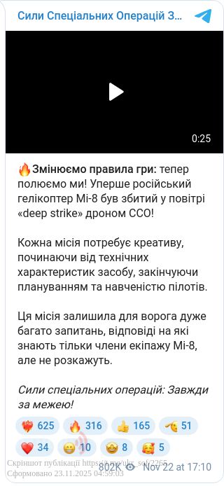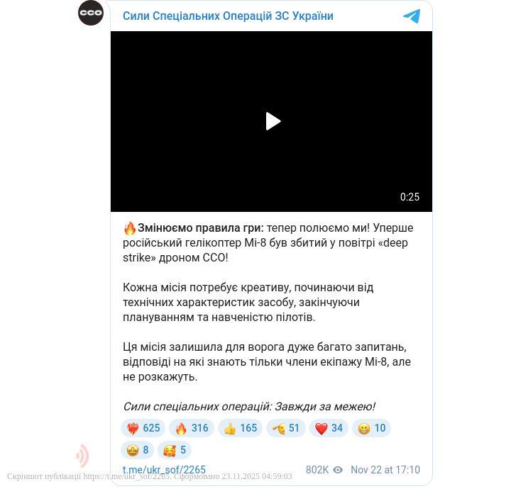 У суботу, 22 листопада, Сили спеціальних операцій вперше збили російський гелікоптер Мі-8 безпілотником у повітрі.