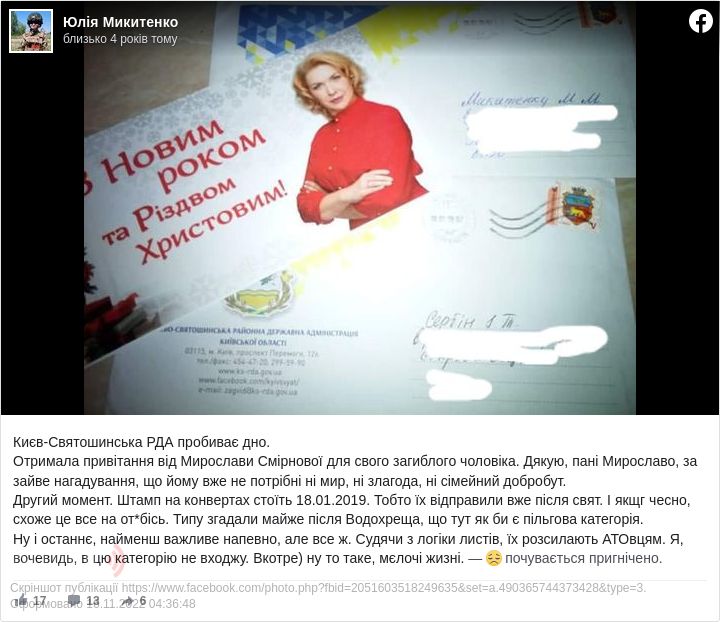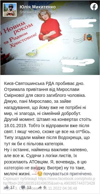 «Києво-Святошинська РДА пробиває дно. Отримала привітання від Мирослави Смірнової для свого загиблого чоловіка. Дякую, пані Мирославо, за зайве нагадування, що йому вже не потрібні ні мир, ні злагода, ні сімейний добробут», — написала жінка.