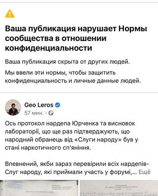 До слова, нещодавно депутат Гео Лерос оприлюднив на своїй сторінці у Facebook допис із протоколом та висновком лабораторії щодо наркотичного сп'яніння нардепа Олександра Юрченка. Утім незабаром йому надійшло повідомлення про те, що опублікований допис «порушує правила соцмережі».