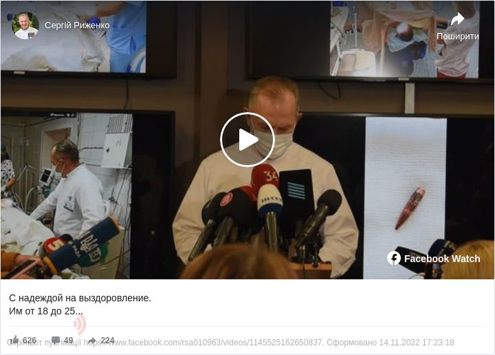 "Їй 22 роки. Її звати Жанна, я встиг навіть поговорити з нею кілька хвилин. Вона не пам'ятає, що відбулось, вона отримала три кулі - в живіт, в плече та в праве коліно. Стан вкрай важкий, коли лікарі відкрили живіт, то весь кишківник був розбитий. Буквально 15 хв закінчили операцію, стан вкрай важкий. Якщо вона виживе, це буде ще один подвиг лікарні Мечнікова", - підсумував Сергій Риженко.