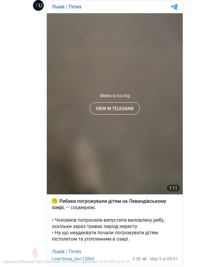 За даними правоохоронців, інцидент стався 4 травня близько 16:40. Діти, побачивши чоловіків, які ловили рибу без дозволу, попросили їх відпустити спійманого коропа назад в озеро. У відповідь правопорушники почали нецензурно висловлюватися і погрожувати дітям фізичною розправою, зокрема, заявивши, що застосують зброю.
