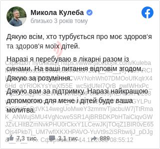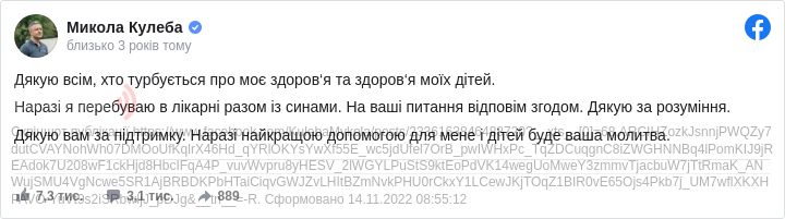 Уповноважений президента з прав дитини Микола Кулеба підтвердив, що перебуває в лікарні разом із синами через аварію, в яку вони потрапили під Києвом.
