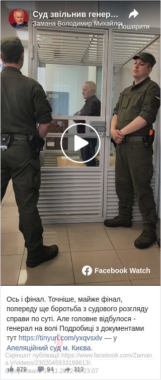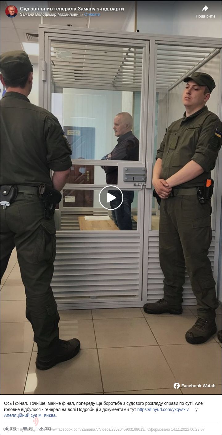 «Генерал-полковник Володимир Замана на волі, тільки що Апеляційний суд скасував ухвалу Печерського суду і звільнив генерала», – повідомляється на сторінці. Також опубліковано відео із засідання суду, на якому зачитувалося рішення щодо справи Замани.