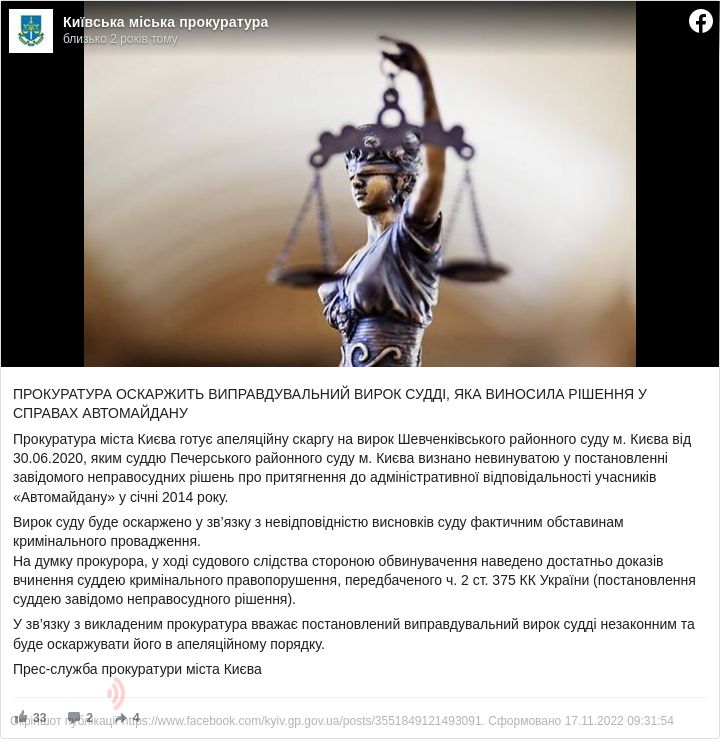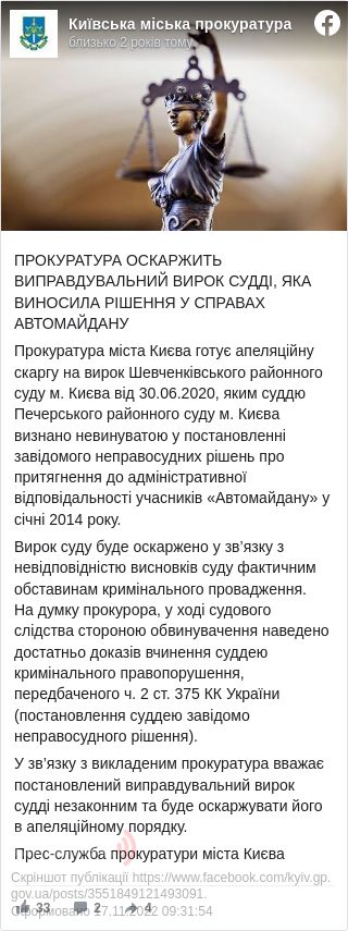 Прокуратура Києва повідомила, що вважає виправдання судді незаконним та буде його оскаржувати.