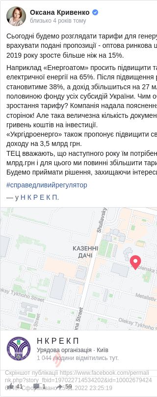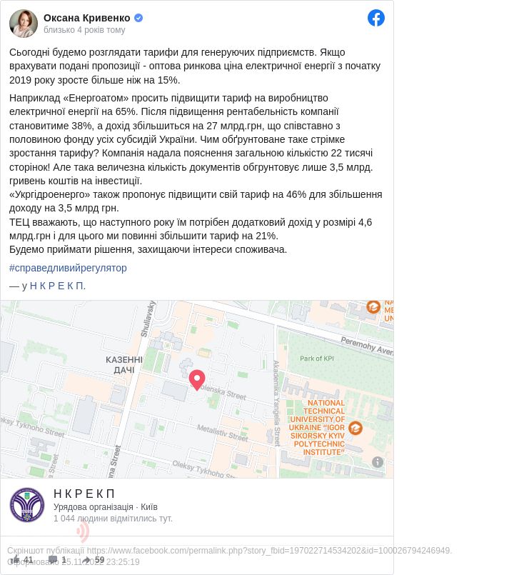 "Наприклад, «Енергоатом» просить підвищити тариф на виробництво електричної енергії на 65 %. Після підвищення рентабельність компанії становитиме 38 %, а дохід збільшиться на 27 млрд грн, що співставно з половиною фонду усіх субсидій України. Чим обґрунтоване таке стрімке зростання тарифу? Компанія надала пояснення загальною кількістю 22 тисячі сторінок! Але така величезна кількість документів обґрунтовує лише 3,5 млрд гривень коштів на інвестиції", — зауважила Кривенко.