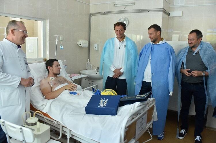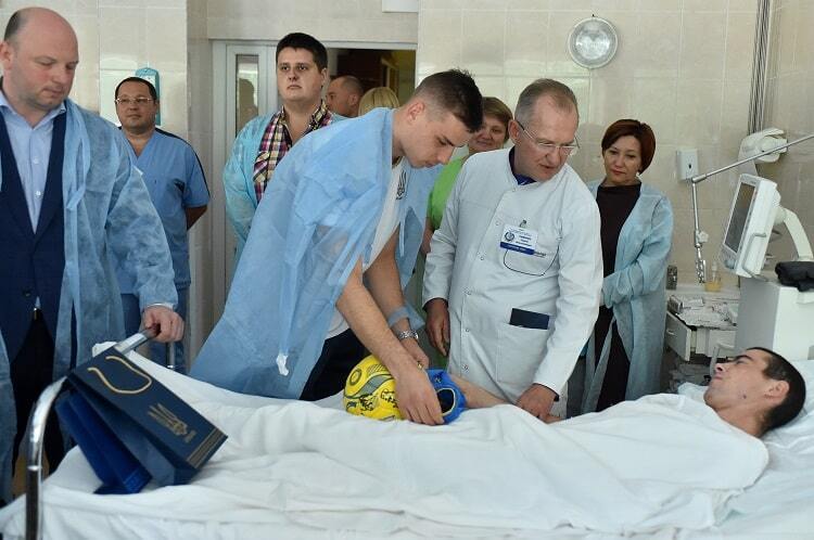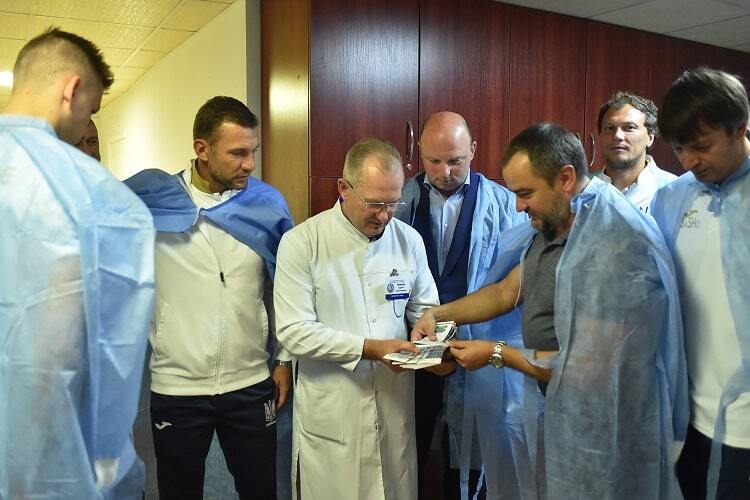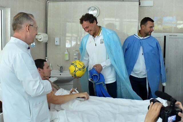 Екс-збірники, а зараз тренери Андрій Шевченко та Олександр Шовковський, а також їхні підопічні Євген Коноплянка, Андрій Пятов та Андрій Лунів подарували військовим пам'ятні сувеніри, а працівникам лікарні - квитки на товариський матч з Нігерією, який пройде 10 вересня.