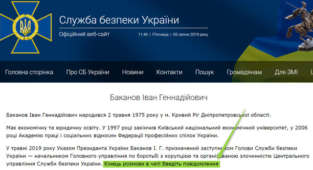 Так, в останньому абзаці біографії Баканова містилася фраза «Кінець розмови в чаті. Введіть повідомлення». Це свідчить про те, що підлеглі глави української спецслужби просто скопіювали розміщений текст із внутрішнього чату, забувши перевірити і видалити зайве.
