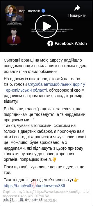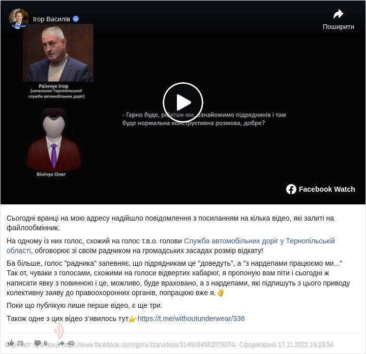 5 червня на своїй сторінці у Facebook член транспортного комітету Верховної Ради Ігор Василів («Слуга народу») опублікував аудіозаписи із голосом, схожим на в. о. начальника Служби автомобільних доріг в Тернопільській області, де він начебто зі своїм помічником обговорюють кількість відкатів від будівництва доріг.