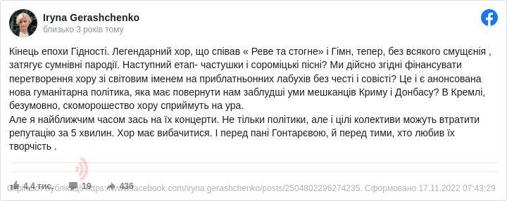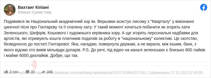 Разом із політиками коментують скандал і представники культурної сфери. Так, журналіст та історик Вахтанг Кіпіані радить палити хати Зеленського, Шефірів, Кошового і художнього керівника хору…