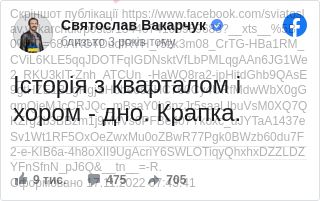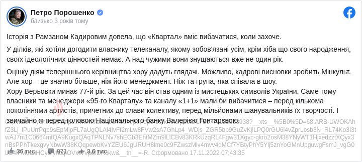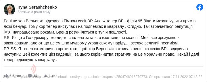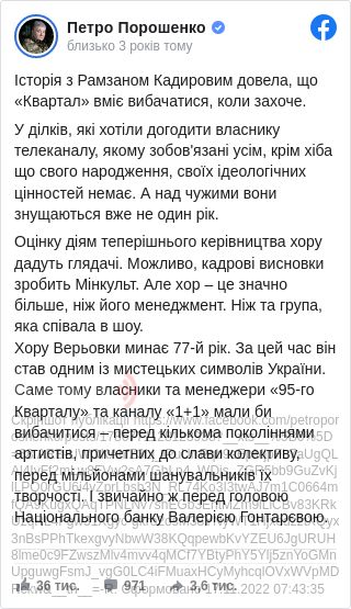 Бо це ганьба для національного хору – виступати на сцені «Кварталу»? Мабуть, що так. Але хіба ж тоді не ганьба віддавати владу у руки «Кварталу», ходити на його концерти (чим до сьогодні, як з’ясувалось, займалася і вищезгадана Ірина Геращенко, і експрезидент Петро Порошенко), переглядати ці шоу на телебаченні й коментувати тепер в соцмережах, доводячи тим самим перегляди до захмарних чисел?