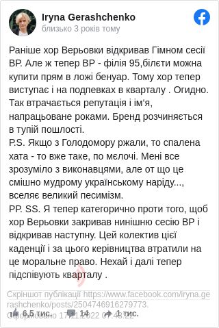 Співголова парламентської фракції «Європейська солідарність» Ірина Геращенко порівняла спалену хату із Голодомором: