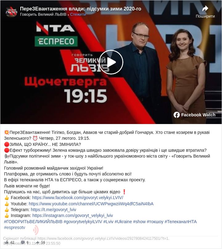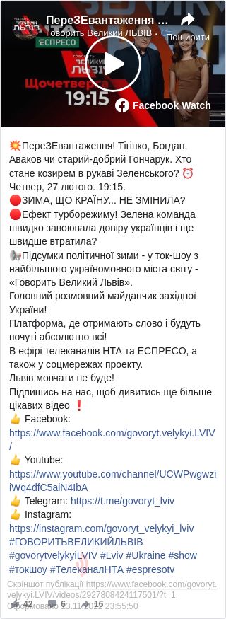 📢Підсумки політичної зими - у ток-шоу з найбільшого україномовного міста світу - сьогодні, 27 лютого, о 19:15 год в ефірі ток-шоу “Говорить Великий Львів” на телеканалах НТА та Еспресо, а також у соцмережах проекту.