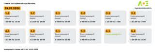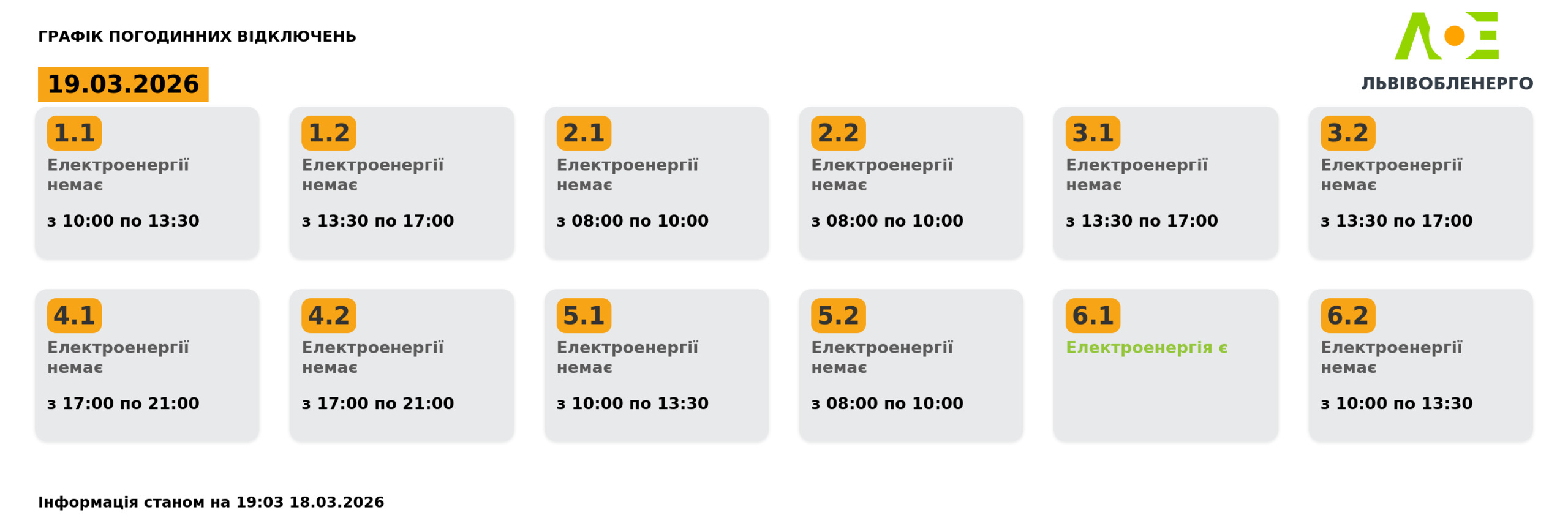 Згідно з офіційним графіком на 19.03.2026, електропостачання буде відсутнє у такі часові проміжки: