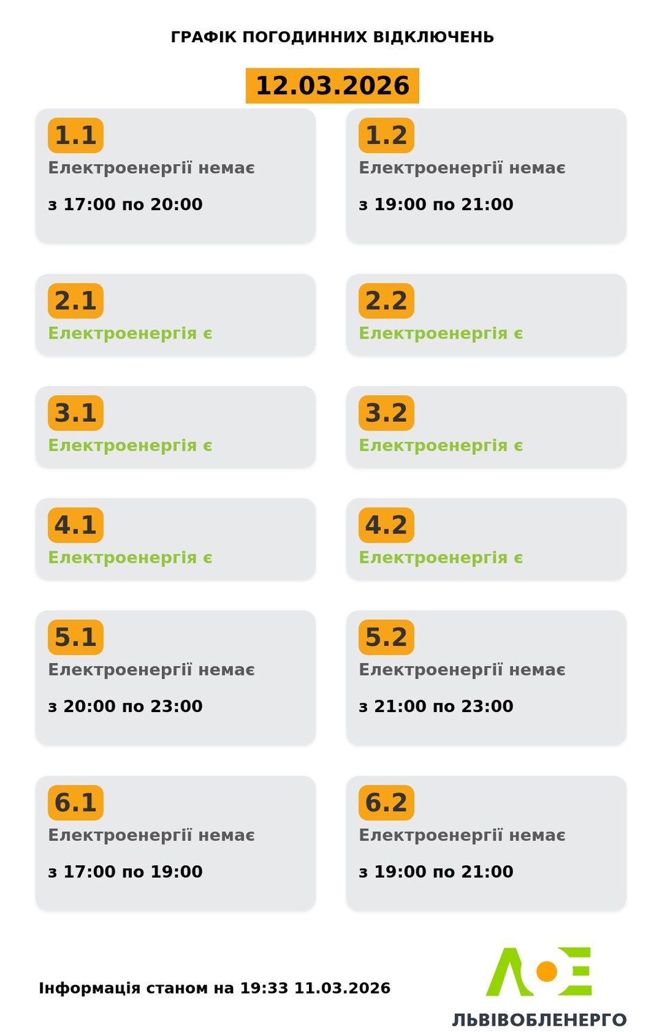 Про це повідомили в компанії та опублікували графік відключення світла на 12 березня.